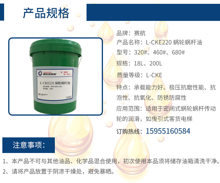 賽航蝸輪蝸桿油主要用于鋼-銅配對(duì)的圓柱型承受重負(fù)荷、傳動(dòng)中有振動(dòng)和沖擊、啟動(dòng)頻繁的蝸輪蝸桿副,包括該設(shè)備中的齒輪、軸承等部件的潤(rùn)滑。