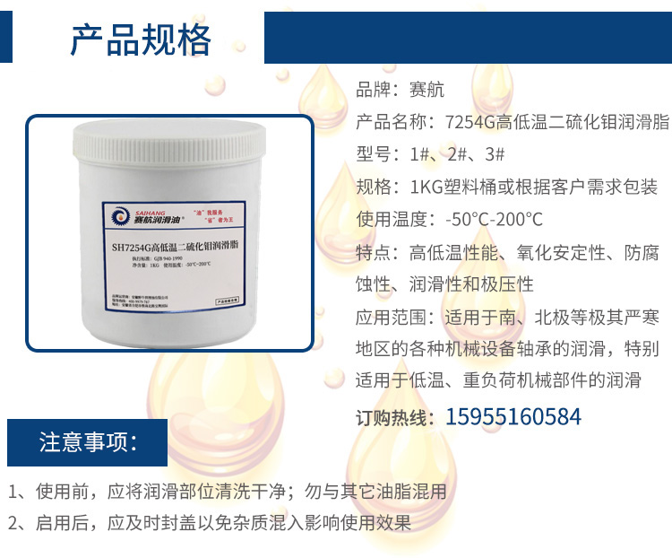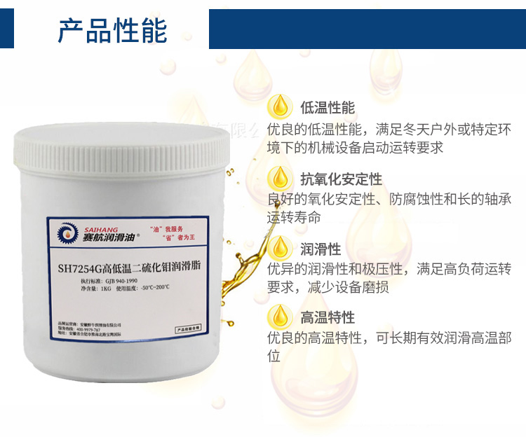 賽航7254G高低溫二硫化鉬潤滑脂以新型復(fù)合稠化劑稠化合成油,并加入多種高效添加劑精制而成。具有優(yōu)良的高低溫特性,適用于南、北極等極其嚴(yán)寒地區(qū)的各種機(jī)械設(shè)備軸承的潤滑,特別適用于低溫、重等符合機(jī)械部件的潤滑;應(yīng)用于大型卡車、鏟車、礦山挖掘與運輸機(jī)械的軸承和齒輪等重負(fù)荷潤滑。